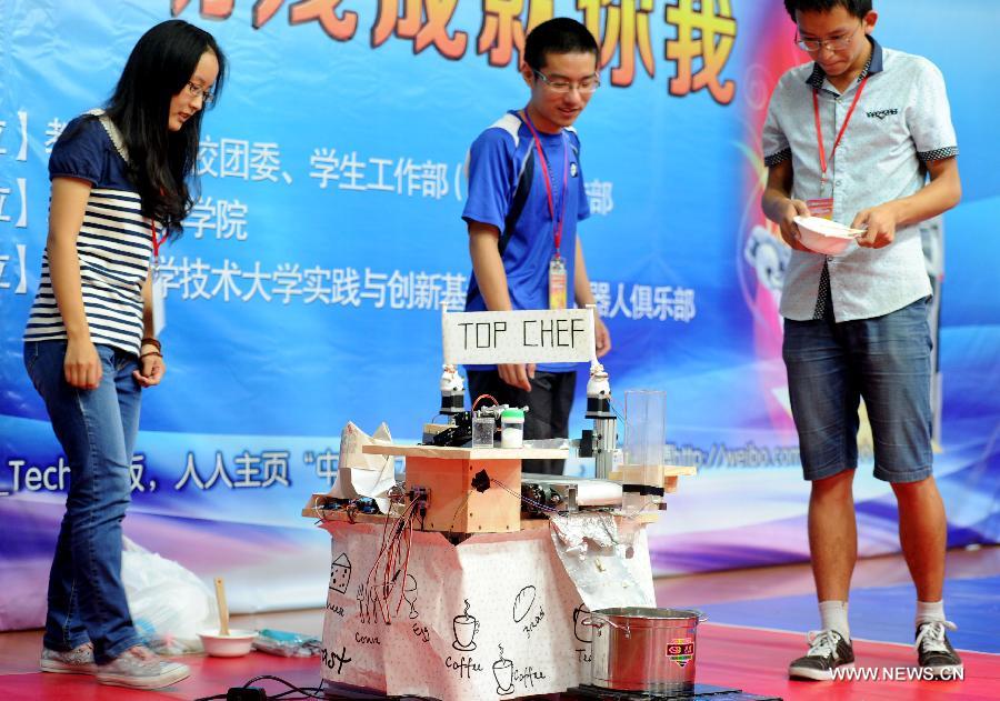 A robot uses a microwave oven to cook noodles in the 14th RoboGame Robot Competition at University of Science and Technology of China in Hefei, capital of east China's Anhui Province, Sept. 27, 2014. The robot competition, with the participation of a total of 36 teams, aims to improve the innovation capability and strengthen the hand-on practice of university students.(Xinhua/Liu Junxi)