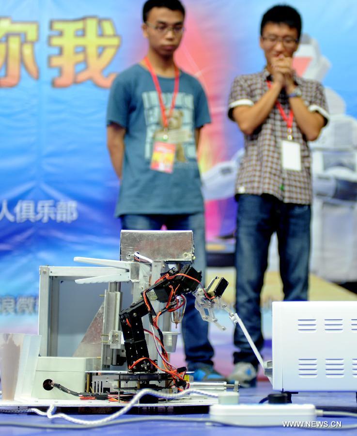 A robot uses a microwave oven to brake cakes in the 14th RoboGame Robot Competition at University of Science and Technology of China in Hefei, capital of east China's Anhui Province, Sept. 27, 2014. The robot competition, with the participation of a total of 36 teams, aims to improve the innovation capability and strengthen the hand-on practice of university students.(Xinhua/Liu Junxi)