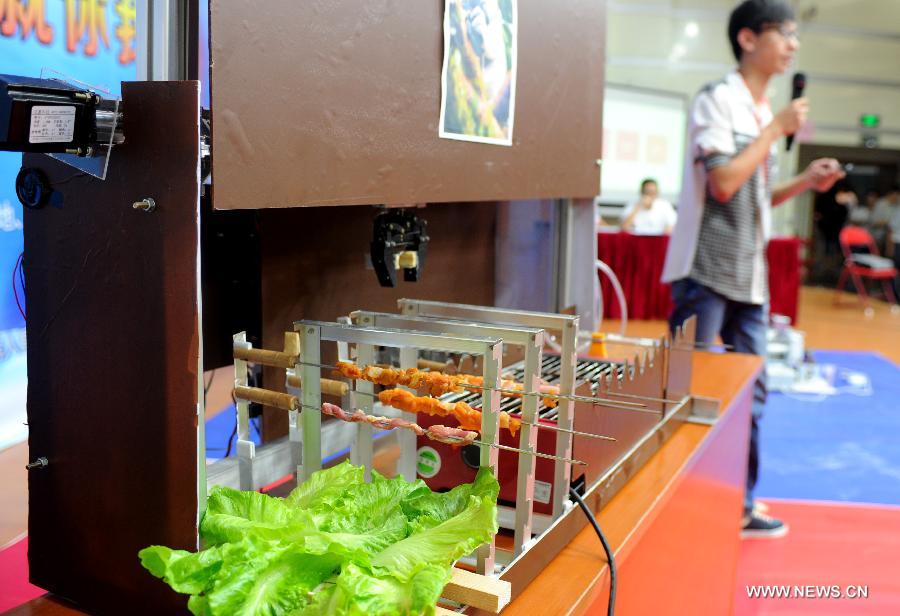 | A robot makes barbecue food in the 14th RoboGame Robot Competition at University of Science and Technology of China in Hefei, capital of east China's Anhui Province, Sept. 27, 2014. The robot competition, with the participation of a total of 36 teams, aims to improve the innovation capability and strengthen the hand-on practice of university students.(Xinhua/Liu Junxi) |