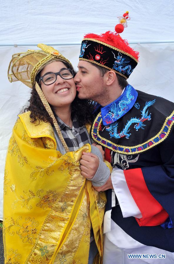 Estonian people dress up Chinese costumes for showing up in Talinn, Estonia, on Sept. 27, 2014. Various Chinese cultural activities marking the first Confucius Institute Day or 10th anniversary of the institute's establishment held at campus at Tallinn University in Tallinn, captital of Estonia on Saturday. (Xinhua/Viktor Vesterinen)