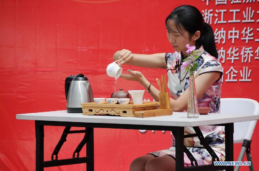 A Chinese teacher gives a performance on Chinese tea culture during a ceremony organized by the Confucius Institute of the University of Ghana in Accra, capital of Ghana, on Sept. 27, 2014. The activity took place as part of the celebrations for the Day of the Confucius Institute. (Xinhua/Lin Xiaowei)