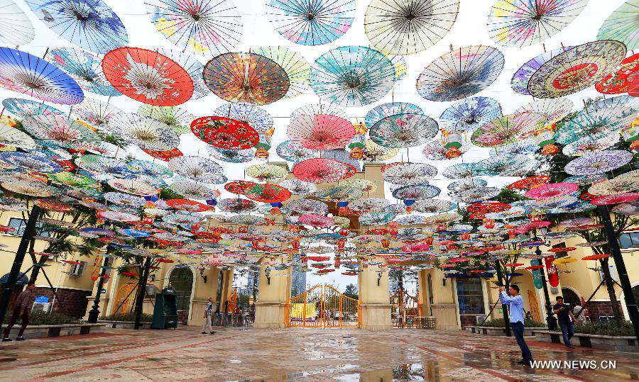 A visitor takes a photo of oil-paper umbrellas at an exhibition held to celebrate the upcoming National Day which falls on Oct. 1, in Luzhou, southwest China's Sichuan Province, Sept. 28, 2014. (Xinhua/Liu Xueyi)