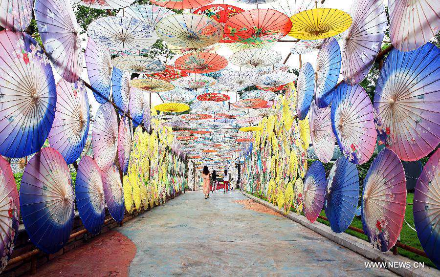 Photo taken on Sept. 28, 2014 shows oil-paper umbrellas at an exhibition held to celebrate the upcoming National Day which falls on Oct. 1, in Luzhou, southwest China's Sichuan Province. (Xinhua/Liu Xueyi)