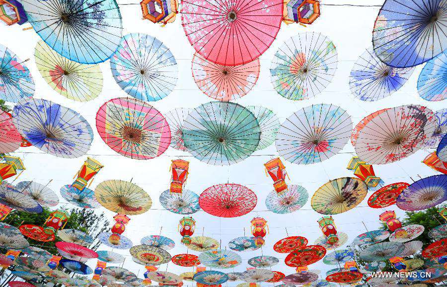 Photo taken on Sept. 28, 2014 shows oil-paper umbrellas at an exhibition held to celebrate the upcoming National Day which falls on Oct. 1, in Luzhou, southwest China's Sichuan Province. (Xinhua/Liu Xueyi)