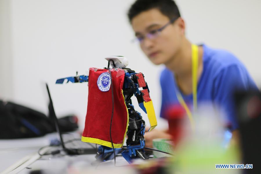 A student debugs his robot before competing in the second college students robot competition of north China's Tianjin Municipality, Sept. 28, 2014. Teams from nine universities and colleges participated in the competition which kicked off at Tianjin Polytechnic University Sunday. (Xinhua)