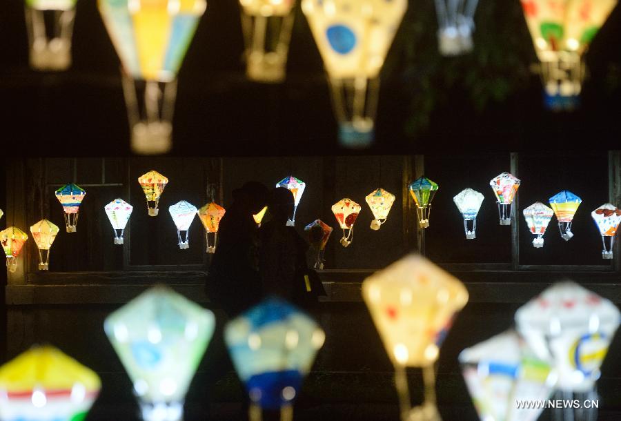 People view colorful lanterns at Tiehua Music Village in Taitung, southeast China's Taiwan, late Sept. 28, 2014. Artists and locals made and painted some 3,000 hot-air-balloon-shaped lanterns this summer to decorate the nearby meadow of the village, echoing the annual balloon fiesta of the city. (Xinhua/Wang Qingqin)