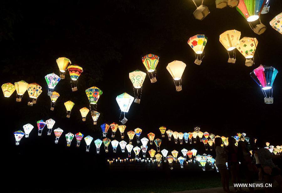 Girls view colorful lanterns at Tiehua Music Village in Taitung, southeast China's Taiwan, late Sept. 28, 2014. Artists and locals made and painted some 3,000 hot-air-balloon-shaped lanterns this summer to decorate the nearby meadow of the village, echoing the annual balloon fiesta of the city. (Xinhua/Wang Qingqin)