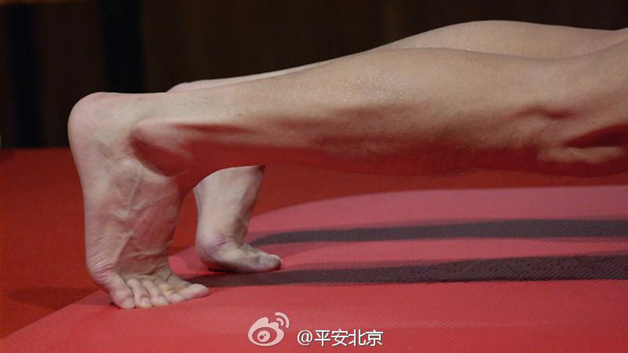 As reported by the official microblog site of Beijing Public Security Bureau on Sept. 26, Mao Weidong, a 43-year-old Special Weapons and Tactics (SWAT) member, breaks the Guinness World Record for "longest time in an abdominal plank position" with a record of four hours and twenty six minutes, smashing the previous three hours and seven minutes one set in 2013. "He wins not only physically, but also mentally! We are here cheering for him! Beijing SWAT Unit will always dedicate to ensure social security, preserve public order, protect people's lives as well as property and security of the capital," says the site. (Photo/weibo.com)