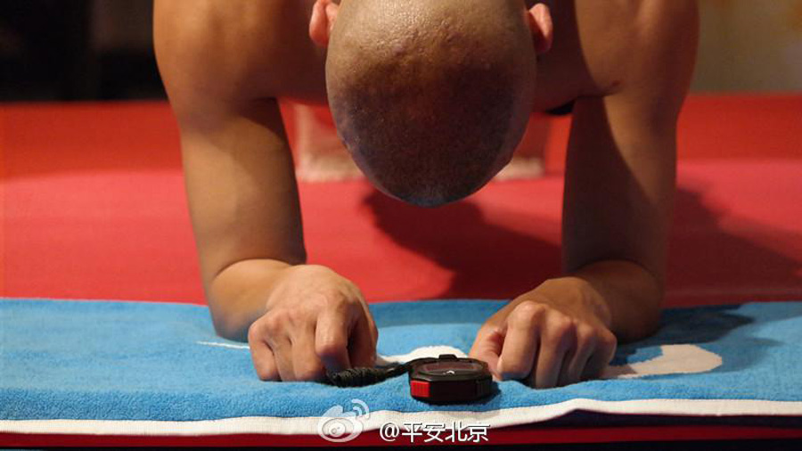 As reported by the official microblog site of Beijing Public Security Bureau on Sept. 26, Mao Weidong, a 43-year-old Special Weapons and Tactics (SWAT) member, breaks the Guinness World Record for "longest time in an abdominal plank position" with a record of four hours and twenty six minutes, smashing the previous three hours and seven minutes one set in 2013. "He wins not only physically, but also mentally! We are here cheering for him! Beijing SWAT Unit will always dedicate to ensure social security, preserve public order, protect people's lives as well as property and security of the capital," says the site. (Photo/weibo.com)