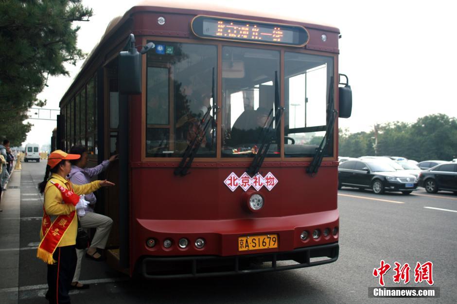 A tour bus which preserves the classic look of Dangdang trolley departs from a bus stop in Beijing, September 28, 2014. The new bus route came into service on Sunday, attracting many riders. (Photo: China News Service/Yang Yanyu)