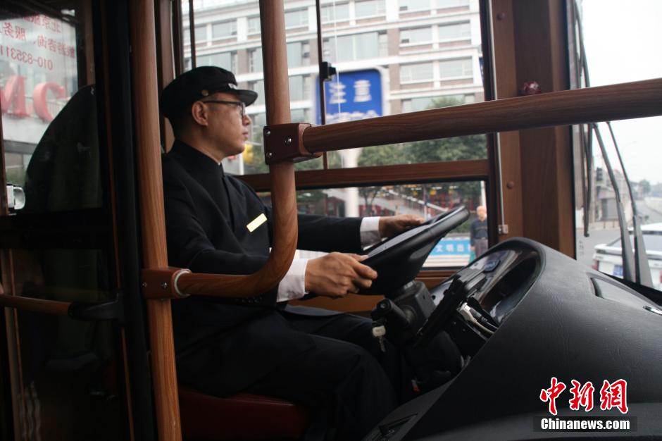 A tour bus which preserves the classic look of Dangdang trolley departs from a bus stop in Beijing, September 28, 2014. The new bus route came into service on Sunday, attracting many riders. (Photo: China News Service/Yang Yanyu)