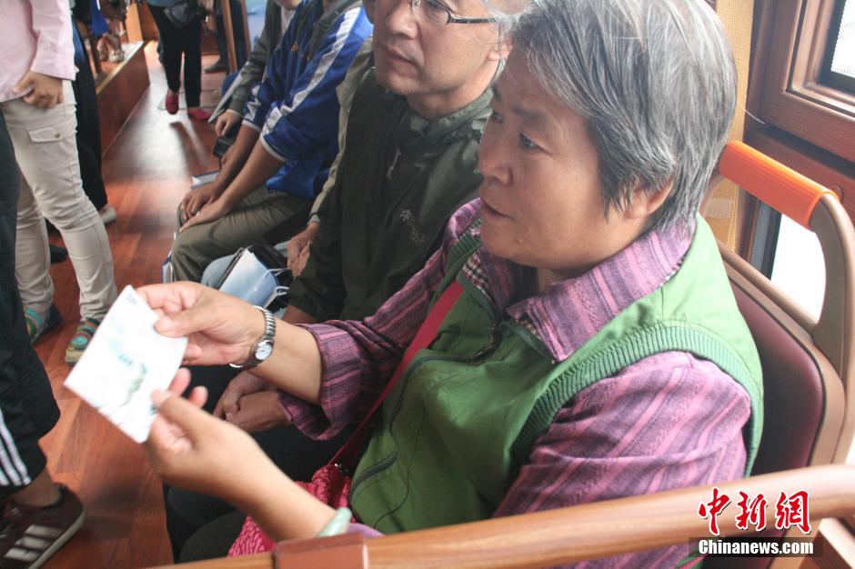 A tour bus which preserves the classic look of Dangdang trolley departs from a bus stop in Beijing, September 28, 2014. The new bus route came into service on Sunday, attracting many riders. (Photo: China News Service/Yang Yanyu)