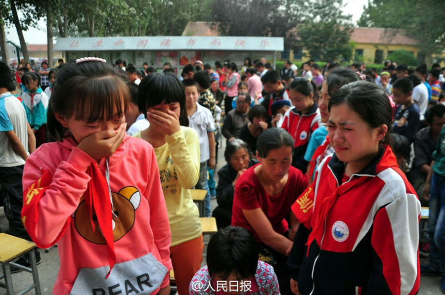 Guided by the speaker, hundreds of students, parents and teachers lose control of their emotions at a speech event with the theme "Be thankful to parents and teachers" held in a primary school in Chiping County in Shandong province on Sept. 25, 2014. (Photo/Dayoo.com)