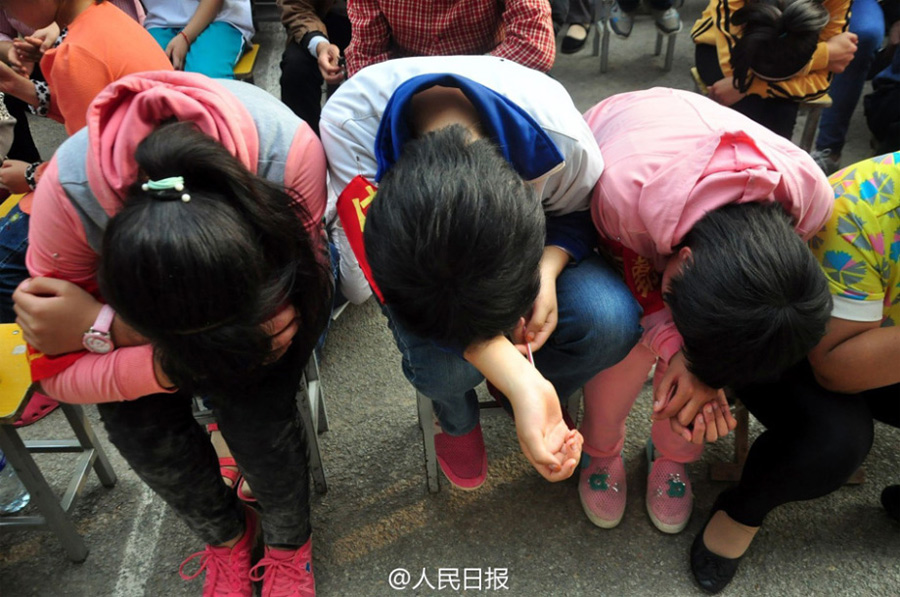 Guided by the speaker, hundreds of students, parents and teachers lose control of their emotions at a speech event with the theme "Be thankful to parents and teachers" held in a primary school in Chiping County in Shandong province on Sept. 25, 2014. (Photo/Dayoo.com)