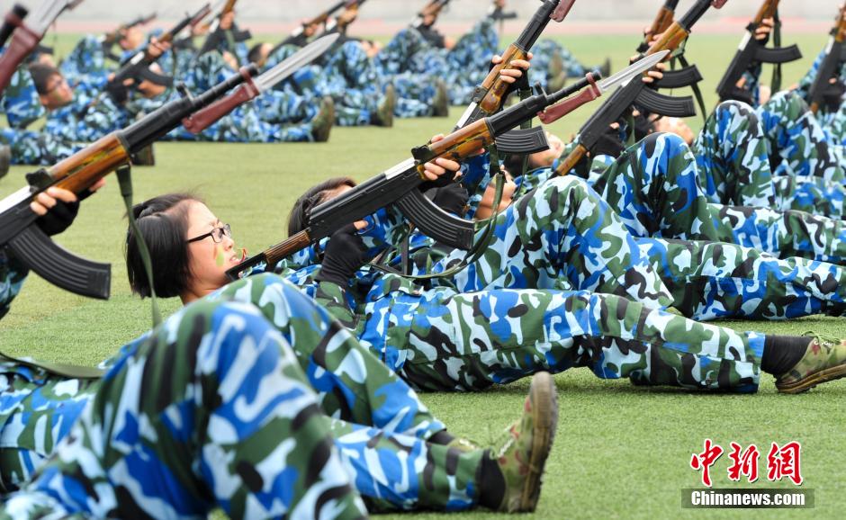 The ceremonial parade of the freshmen of Shandong University is held in Jinan, east China's Shandong province on Sept. 27, 2014. Female students were trained to use guns and to beat "enemies" in the course of catch and grapple. (CNS/Zhang Yong)
