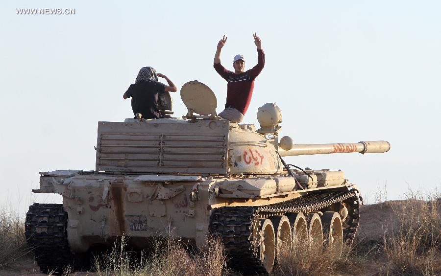 A Libya Dawn fighter poses for picture in his tank in Wershfana region in Tripoli, Libya, on Sept. 29, 2014. Heavy clashes continued between Libya Dawn fighters and local militias on Monday in Tripoli's Wershfana region. (Xinhua/Hamza Turkia)