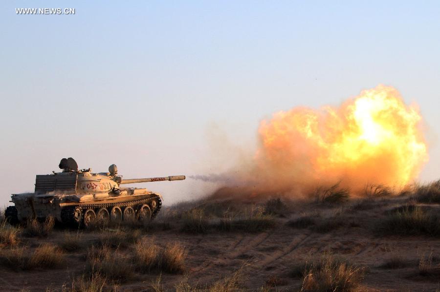 A Libya Dawn tank fires in Wershfana region in Tripoli, Libya, on Sept. 29, 2014. Heavy clashes continued between Libya Dawn fighters and local militias on Monday in Tripoli's Wershfana region. (Xinhua/Hamza Turkia)