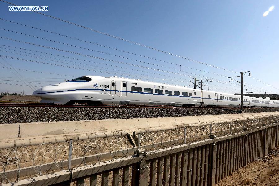 A bullet train runs on its trial trip in Hami, northwest China's Xinjiang Uygur Autonomous Region, Sept. 16, 2014. The 1,776-km Lanxin Railway, which links Lanzhou City in northwestern Gansu Province and Urumqi City in Xinjiang Uygur Autonomous Region, will be Xinjiang's first high-speed railway when it begins operation by the end of this year. The Xinjiang section of the railway will be firstly put into service in October. (Xinhua/Cai Zengle)