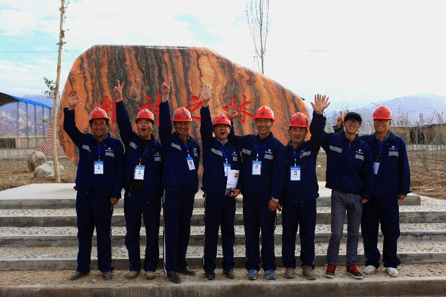 Photo taken on Sept. 16, 2014 shows the highway constructors posing for group photo in front of a monument in the Qaidam Basin in northwest China's Qinghai Province. With their efforts, a new highway linking Beijing to Golmud is scheduled to open to traffic in 2015. The year of 2014 marks the 60th anniversary of the opening of the Qinghai-Tibet highway. The highway, linking Xining, capital city of Qinghai province, and Lhasa, capital of the Tibet Autonomous Region, is a lifeline for Qinghai-Tibet Plateau. It boosts economic growth of regions along the road and makes lots of people's dreams come true. (Xinhua/Guo Qiuda)