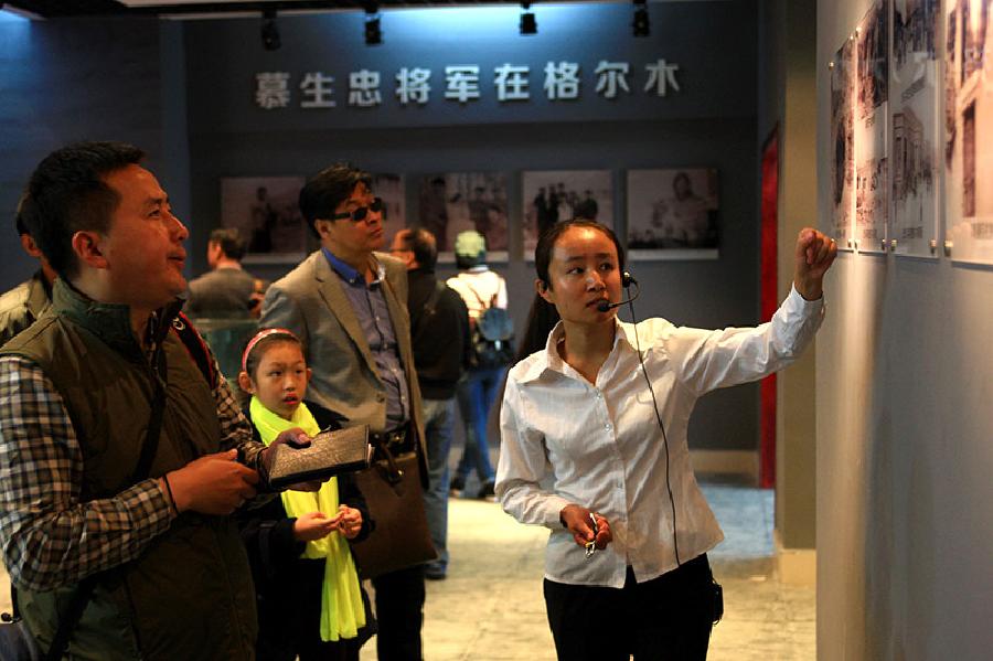 Photo taken on Sept. 18, 2014 shows Ma Xiaona, a guide of General Mu Shenzhong Memorial Museum in Golmud, northwest China's Qinghai Province. As a guide, Ma Xiaona tells about history of the Qinghai-Tibet highway to tourists. The year of 2014 marks the 60th anniversary of the opening of the Qinghai-Tibet highway. The highway, linking Xining, capital city of Qinghai province, and Lhasa, capital of the Tibet Autonomous Region, is a lifeline for Qinghai-Tibet Plateau. It boosts economic growth of regions along the road and makes lots of people's dreams come true. (Xinhua/Guo Qiuda)