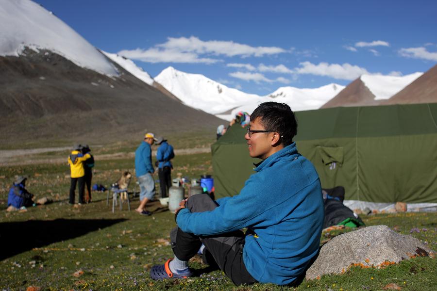 Photo taken on July 18, 2014 shows Zhang Mohan, team leader of Mountaineering Association of Peking University, having a rest in the base camp at the foot of Geladaindong Mountain, northwest China's Qinghai Province. His team reached the top of the 6,621-meter-high Geladaindong Peak this year. The year of 2014 marks the 60th anniversary of the opening of the Qinghai-Tibet highway. The highway, linking Xining, capital city of Qinghai province, and Lhasa, capital of the Tibet Autonomous Region, is a lifeline for Qinghai-Tibet Plateau. It boosts economic growth of regions along the road and makes lots of people's dreams come true. (Xinhua/Guo Qiuda)