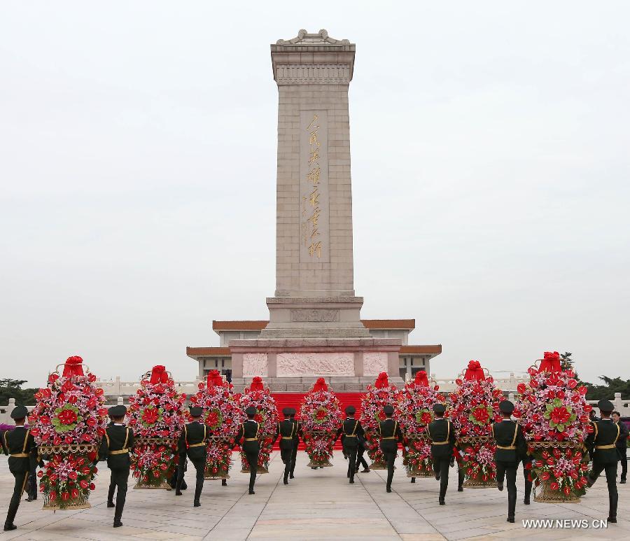 | Soldiers present flower baskets to the deceased national heroes at the Monument to the People's Heroes in Tian'anmen Square, downtown Beijing, capital of China, Sept. 30, 2014, on the occasion of the first Martyrs' Day. China's top legislature set Sept. 30 as Martyrs' Day last month. (Xinhua/Pang Xinglei) |
