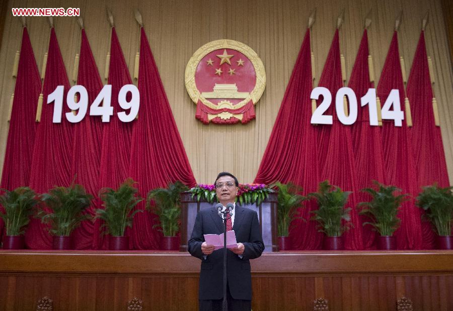 Chinese Premier Li Keqiang presides over the reception held by the State Council to mark the 65th anniversary of the founding of the People's Republic of China, in Beijing, China, Sept. 30, 2014. (Xinhua/Li Xueren)