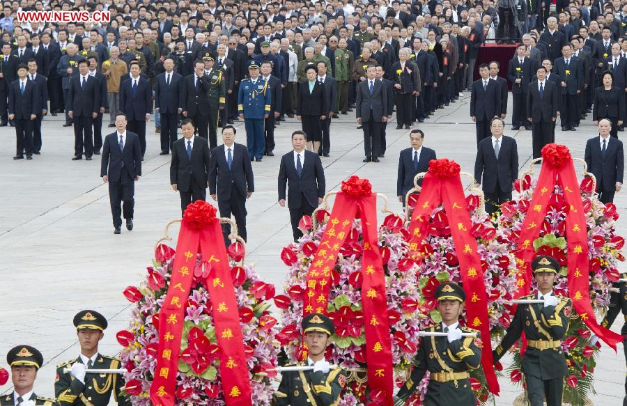 Chinese leaders Xi Jinping, Li Keqiang, Zhang Dejiang, Yu Zhengsheng, Liu Yunshan, Wang Qishan and Zhang Gaoli offer flower baskets at the Monument to the People's Heroes in Beijing's Tian'anmen Square on Sept. 30, 2014, the first Martyrs' Day. (Xinhua/Huang Jingwen)
