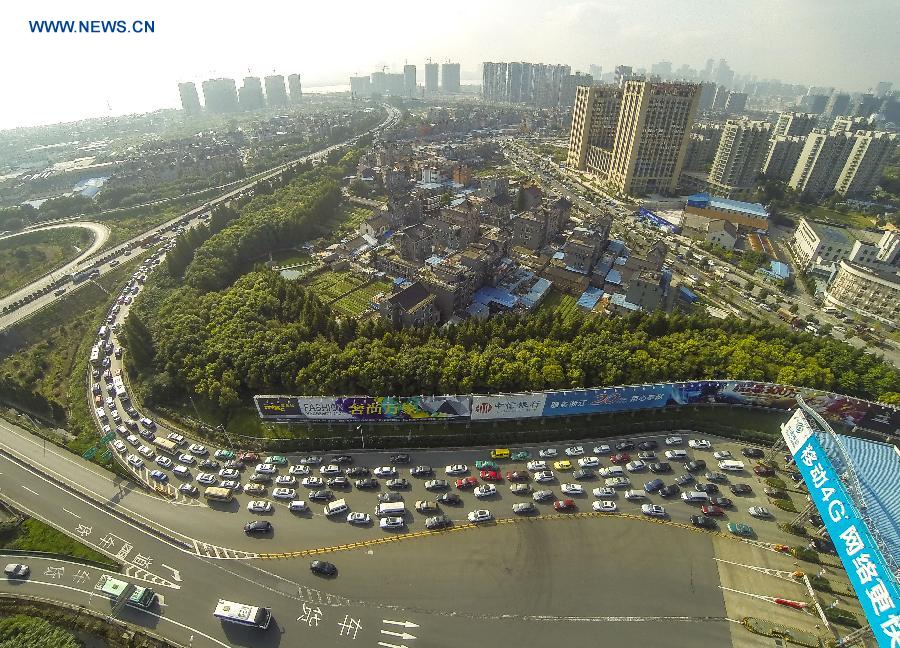 A traffic stream for going out of town makes a sharp contrast with an empty driveway for entering town at a toll station of express way on the first day of the Chinese National Day holidays in Hangzhou, capital of east China's Zhejiang Province, Oct. 1, 2014. The "golden-week" National Day holidays are expected to bring a tourism peak across the country. (Xinhua/Xu Yu)