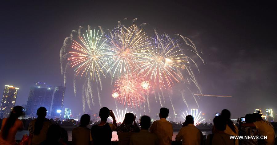 People watch the fireworks at a music fireworks gala celebrating the National Day by the riverside of Xiangjiang River in Changsha, capital of central China's Hunan Province, Oct. 4, 2014. (Xinhua/Long Hongtao)