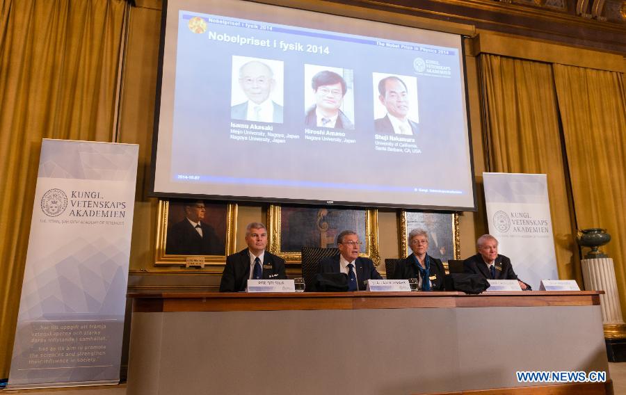 | Staffan Normark (2nd L), permanent secretary of the Royal Swedish Academy of Sciences, announces the winners of the 2014 Nobel Prize in Physics, at the Royal Swedish Academy of Sciences in Stockholm, capital of Sweden, Oct. 7, 2014. Isamu Akasaki and Hiroshi Amano of Japan and Japanese-born U.S. scientist Shuji Nakamura won the 2014 Nobel Prize in Physics for their invention of blue light-emitting diodes, a new energy efficient and environmentally friendly light source, the award-giving body announced Tuesday. (Xinhua/Shi Tiansheng) |