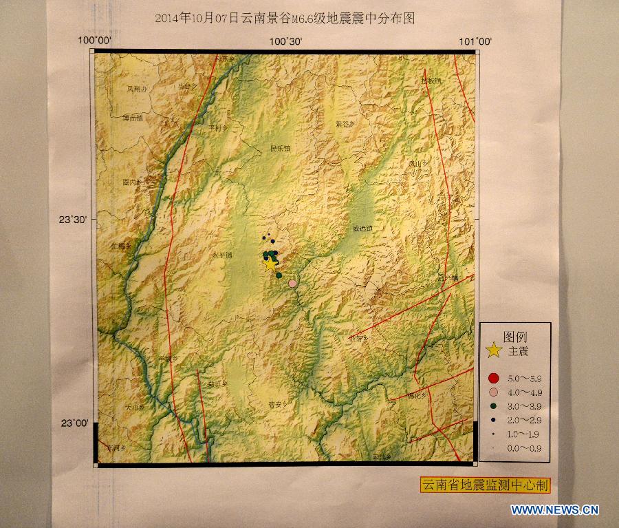 Photo taken on Oct. 7, 2014 shows the epicenter location map of Jinggu County earthquake at the Seismological Bureau of Yunnan Province in Kunming, capital of southwest China's Yunnan Province. A 6.6-magnitude earthquake jolted Jinggu County of Pu'er City in Yunnan at 9:49 p.m. Beijing Time (1349 GMT), according to the China Earthquake Networks Center (CENC). (Xinhua/Hu Chao)