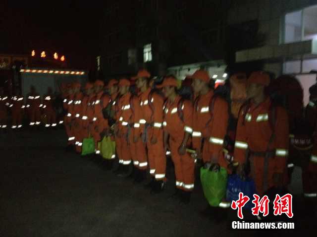 14 fire trucks, 55 firefighters and 2 rescue dogs from Honghe county head to the quake struck area at 11:30 p.m. on October 7. (Chinanews/Zhong Xin)