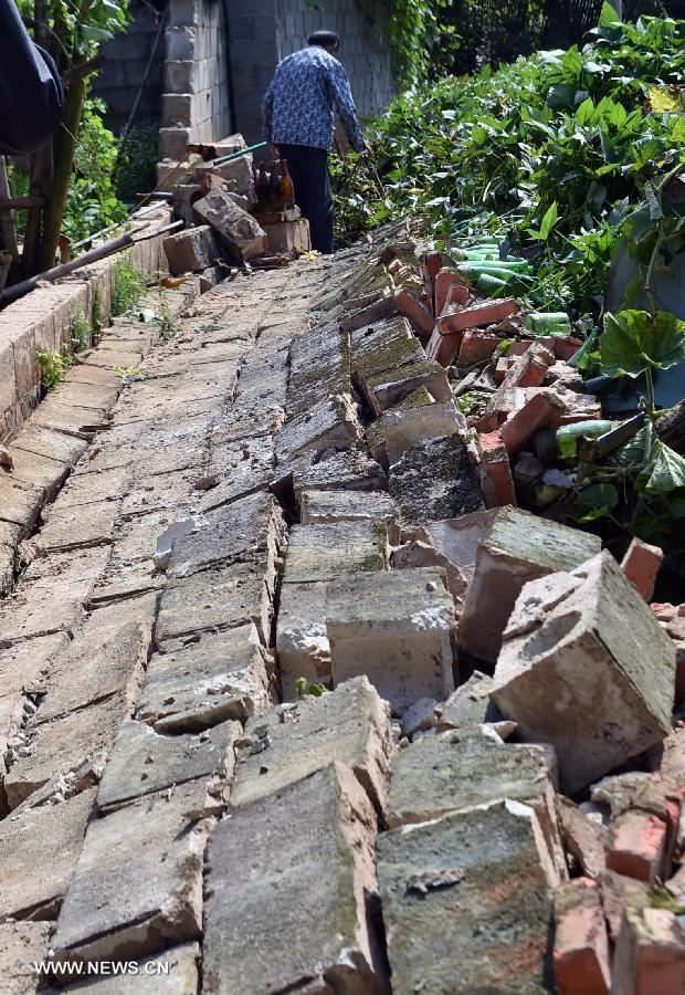 Villager Xu Yongqin (L) cleans up bedclothes in the collapsed house in Mangfei Village under Yongping Township at Jinggu County of Pu'er City, southwest China's Yunnan Province, Oct. 8, 2014. One person died and 324 others were injured after a 6.6-magnitude quake jolted Yunnan Province Tuesday night, according to local government. A total of 6,988 houses collapsed while 13,017 ones were severely damaged. (Xinhua/Chen Haining)