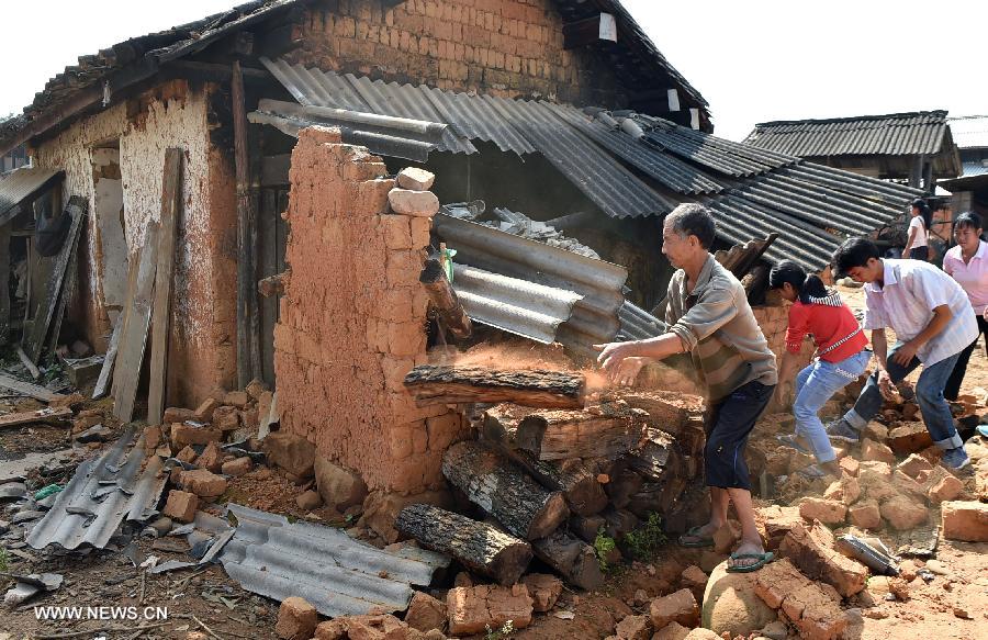 Villager Xu Yongqin (L) cleans up bedclothes in the collapsed house in Mangfei Village under Yongping Township at Jinggu County of Pu'er City, southwest China's Yunnan Province, Oct. 8, 2014. One person died and 324 others were injured after a 6.6-magnitude quake jolted Yunnan Province Tuesday night, according to local government. A total of 6,988 houses collapsed while 13,017 ones were severely damaged. (Xinhua/Chen Haining)