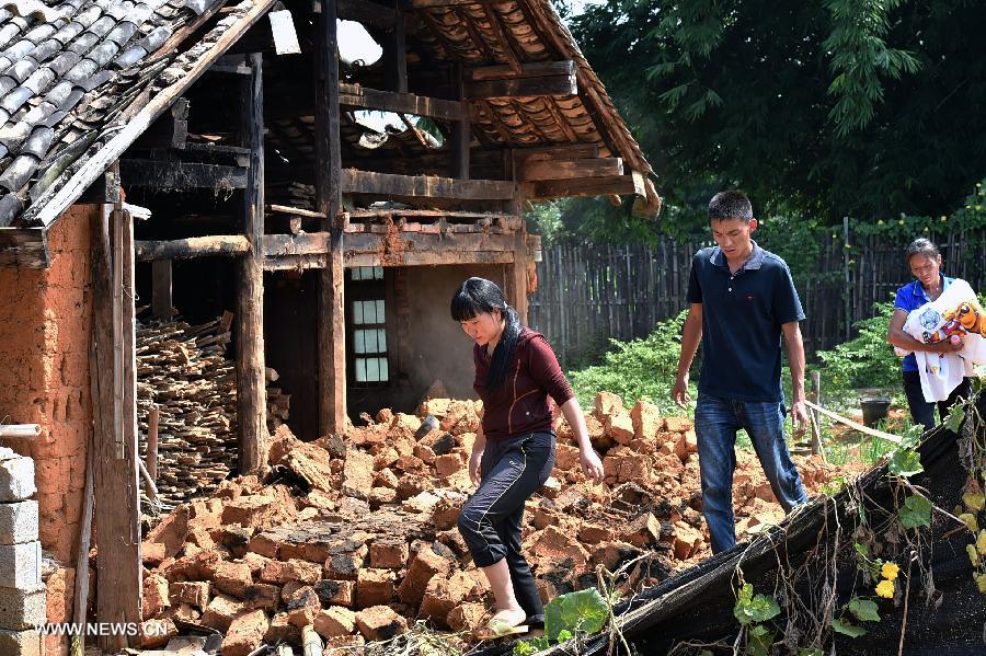 Villager Xu Yongqin (L) cleans up bedclothes in the collapsed house in Mangfei Village under Yongping Township at Jinggu County of Pu'er City, southwest China's Yunnan Province, Oct. 8, 2014. One person died and 324 others were injured after a 6.6-magnitude quake jolted Yunnan Province Tuesday night, according to local government. A total of 6,988 houses collapsed while 13,017 ones were severely damaged. (Xinhua/Chen Haining)