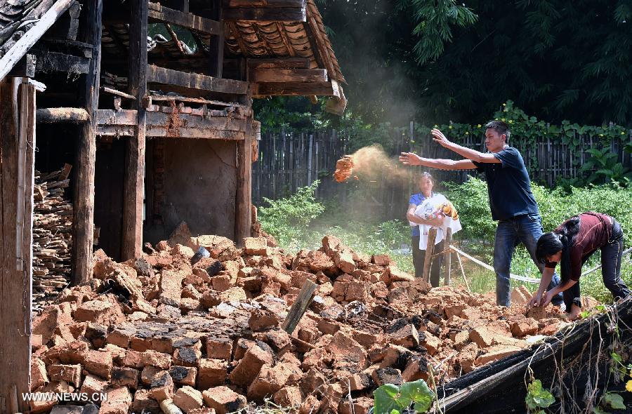 Villager Xu Yongqin (L) cleans up bedclothes in the collapsed house in Mangfei Village under Yongping Township at Jinggu County of Pu'er City, southwest China's Yunnan Province, Oct. 8, 2014. One person died and 324 others were injured after a 6.6-magnitude quake jolted Yunnan Province Tuesday night, according to local government. A total of 6,988 houses collapsed while 13,017 ones were severely damaged. (Xinhua/Chen Haining)