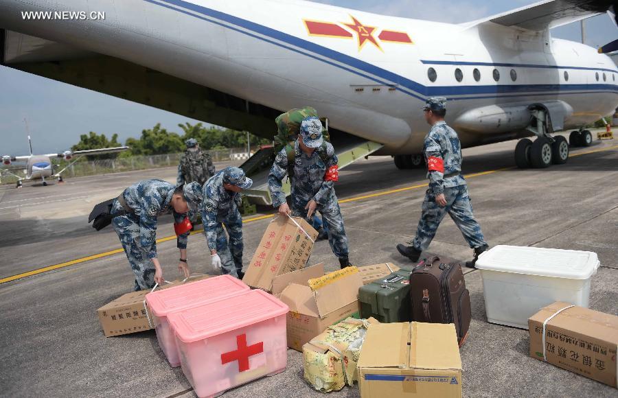 Soldiers carry medical supplies for quake-hit areas at the Simao Airport in southwest China's Yunnan Province, Oct. 8, 2014. Medical staff and supplies from Chengdu Air Force have arrived at the Jinggu County on Wednesday. A 6.6-magnitude quake jolted Yunnan Province Tuesday night. (Xinhua/Xue Yubin)