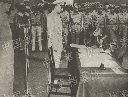 | Mamoru Shigemitsu signed the instrument of surrender on behalf of the Japanese government on Sept.2, 1945. (Photo/Second Historical Archives of China) |