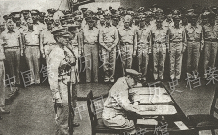 | General of the Army Douglas MacArthur signed the instrument of surrender on Sept.2, 1945. (Photo/Second Historical Archives of China) |