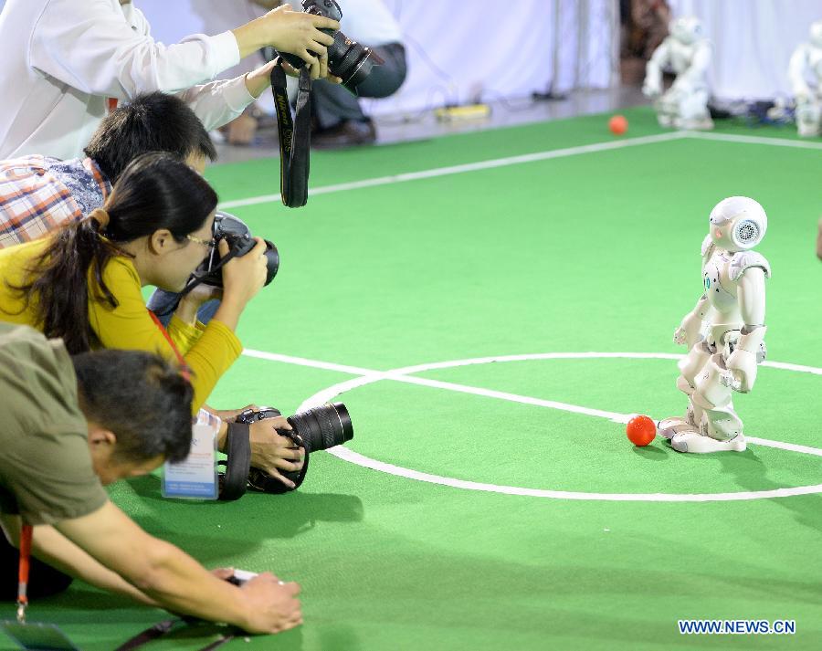 Press photographers take photos of a robot during the 2014 China Robot Competition and the Robocup China in Hefei, capital of east China's Anhui Province, Oct. 10, 2014. Over 2,000 contestants from colleges and universities took part in the competition. (Xinhua/Guo Chen)