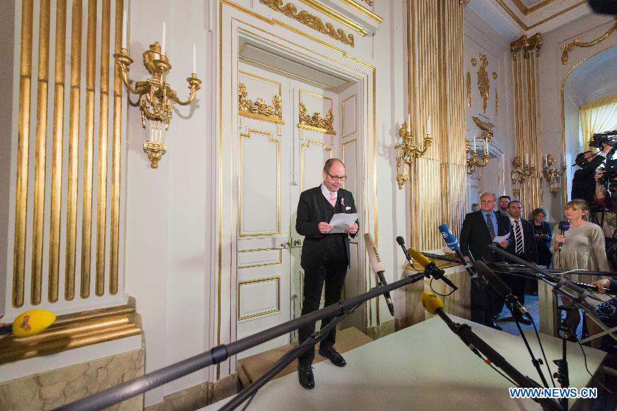 Peter Englund, permanent secretary of the Swedish Academy, announces winner of the 2014 Nobel Prize in Literature as French author Patrick Modiano in Stockholm, capital of Sweden, on Oct. 9, 2014. [Photo: Xinhua/Shi Tiansheng]