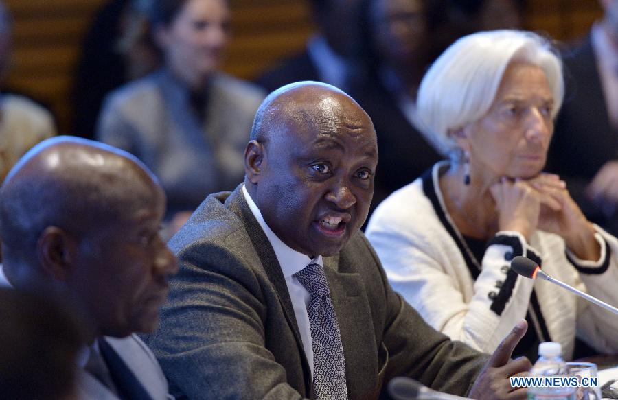 Donald Kaberuka, President of African Development Bank, speaks at a meeting discussing the Ebola impact, possible solutions and how to support countries affected by the Ebola crisis, at the World Bank in Washington D.C., the United States, Oct. 9, 2014. (Xinhua/Yin Bogu)