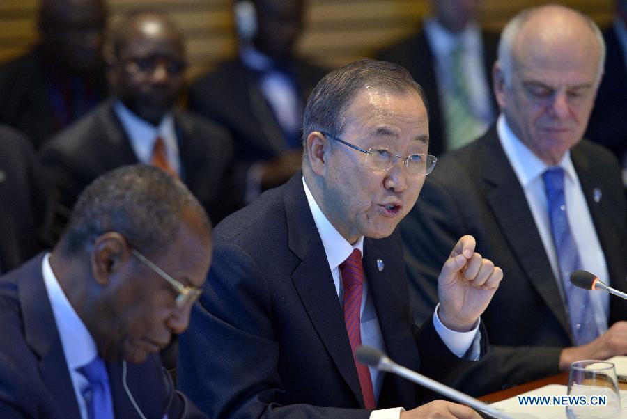 Ban Ki-moon, Secretary-General of United Nations speaks at a meeting discussing the Ebola impact, possible solutions and how to support countries affected by the Ebola crisis, at the World Bank in Washington D.C., the United States, Oct. 9, 2014. (Xinhua/Yin Bogu)