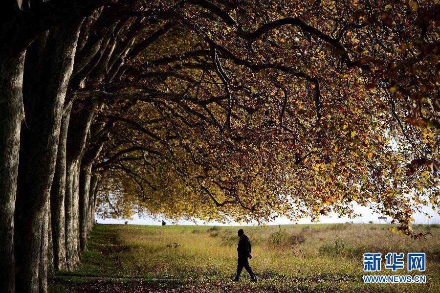 A man walks under a tree with golden leaves near Lausanne, Switzerland. (Xinhua/AFP)