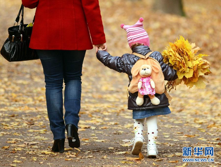 A lovely girl holding a maple walks with a woman in Lviv, west Ukraine. (Xinhua/AFP)