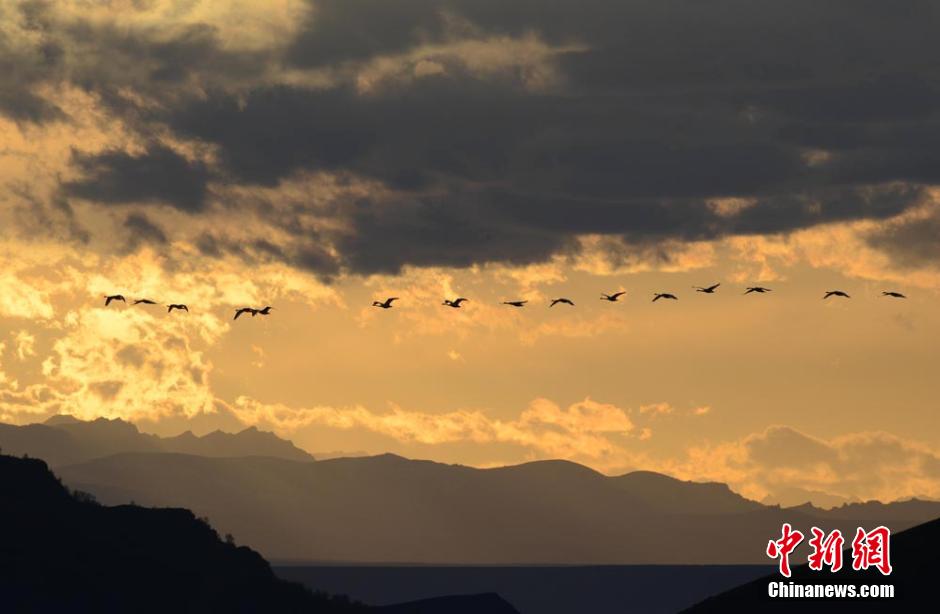 Rows of swans fly over the mountain area of Xinjiang. Swans began to fly away from Xinjiang as it gets colder in October. (Chinanews.com/Hu Re)