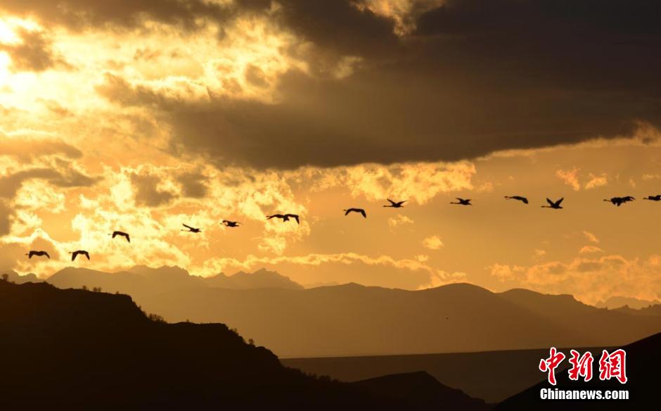 Rows of swans fly over the mountain area of Xinjiang. Swans began to fly away from Xinjiang as it gets colder in October. (Chinanews.com/Hu Re)