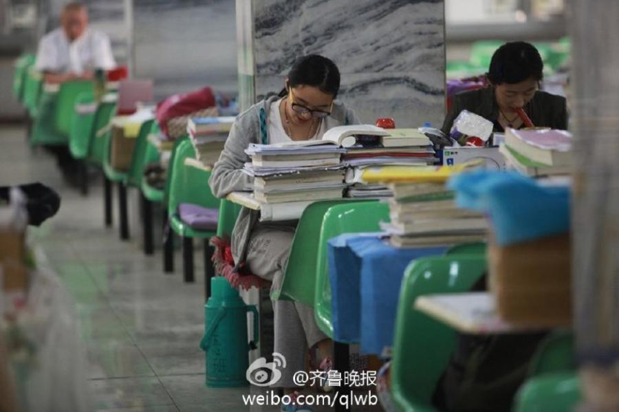 The photo shows students of a university in Jinan, east China's Shandong province, studying in the school canteen to prepare for the postgraduate entrance examination. According to a student, there is only one classroom building nearby, and most of its classrooms were already occupied for lectures. [Photo: weibo.com/qlwb]
