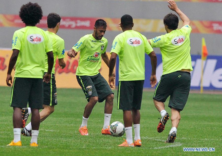 Brazil's Naymar (3rd L) attends a training session one day before a friendly football match between the Brazilian and Argentinian national teams in Beijing, capital of China, Oct 10, 2014. (Xinhua/Gong Lei)